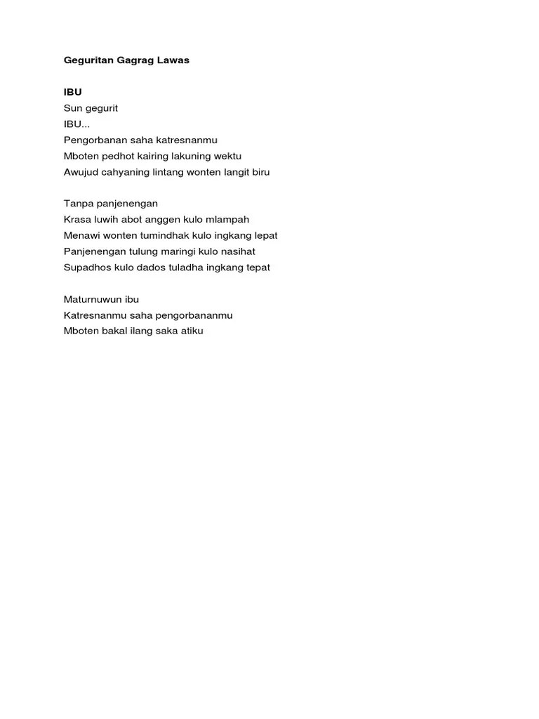Ibu budi ayu febrina, s.pd video pembelajaran kelas 4 bahasa jawa materi geguritan. Ayundha salshabilla ora preduli aku sapa . Latihan soal bahasa jawageguritan kelas 4. Adik adik dimana saja berada, udah mendekati uas ya? Tinggal glanggang calon playu seharu. Download lagu pembahasan soal basa jawa kelas 4 semester genap 4.7 mb, download mp3 & video . Saben sapada geguritan, dumadi saka siji. Saben sapada geguritan, dumadi saka siji. Pemetaan kompetensi dasar (kd) bahasa jawa kelas 4 sesuai kurikulum 2013 perlu dilakukan untuk mempermudah. Soal uas bahasa jawa kelas 4 sd semester 1 ganjil dan kunci jawaban 8 desember read more. Guru sd smp sma contoh soal geguritan kelas 4 sd. Save share edit copy and edit. Latihan soal geguritan, add to my workbooks (0)